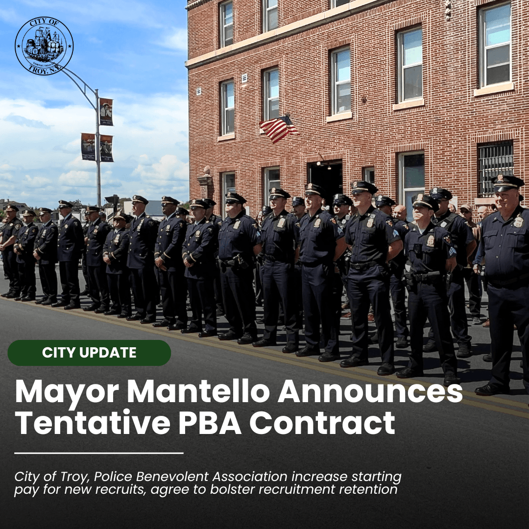Troy, NY (June 17) – Mayor Mantello today announced the City of Troy and the Troy Police Benevolent and Protective Association, Inc. (PBA) have negotiated a Memorandum of Agreement (MOA) to the PBA contract after months of negotiations. The previous agreement expired in 2023.